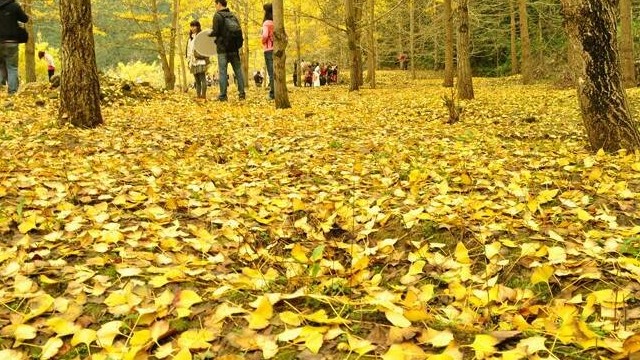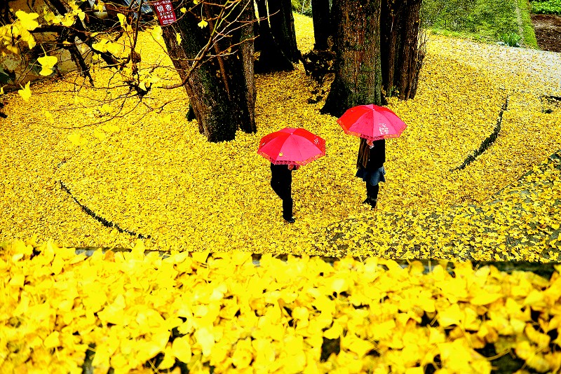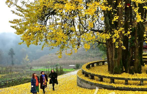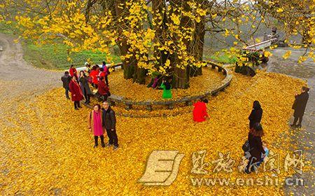 11月19日,游人在恩施州宣恩县珠山镇一棵千年银杏树下游玩。初冬时节,宣恩县珠山镇的一棵千年古银杏披上了金色的外衣,微风吹拂,树叶飘落地面铺成了黄金毯,“醉美”的景色引来游人观光。