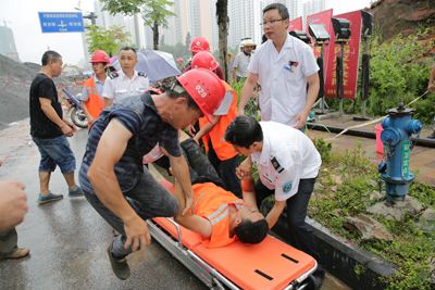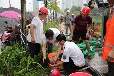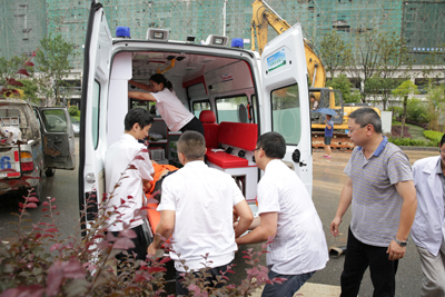 一名现场参与抢险施工的工人突然晕倒在地,全身抽搐。现场急救人员连忙用最快的速度,抬来担架,将躺在地上的工人合力抬上救护车,送往州中心医院进行急救。