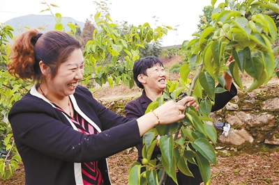 4月23日,巫峡口村计生专干向容正在查看种植大户李厚香的黄金梨今年挂果长势。巴东县农业局、镇农业服务中心确定官渡口镇巫峡口村为“农民田间学校实验实习基地”,在该村发展黄金梨1000亩,今年有300亩挂果。据介绍,该村有400多户种植黄金梨果树,其中有340多户是贫困户,两至三年后,果农种植户可全部脱贫致富。(恩施日报恩施图片库 穆世祝 摄)