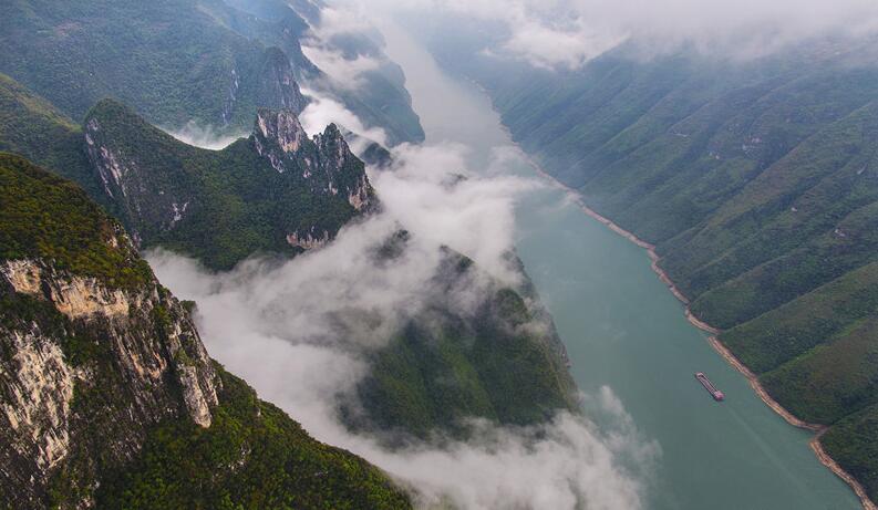 从古至今,很多诗人都曾以诗言景,来表达对三峡云雾美景的称赞。图为无人机雨后航拍长江三峡巫峡段烟雨美景,恰巧印证了诗人李贺笔下“大江翻澜神曳烟”的描绘,雾气从山的各个地方翻涌而出,水清江碧,雾气缭绕,宛如天上仙境。新华网发 王正坤 摄