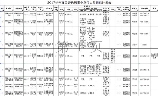 根据恩施州编委关于2017年使用编制选聘州直事业单位工作人员计划,结合州直各选聘单位用人需要,州委组织部、州人社局决定统筹组织实施本次州直事业单位公开选聘工作。本次共18家州直事业单位24个岗位公开选聘36名工作人员,具体岗位见下图: