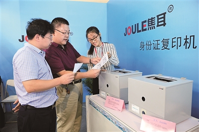图为在邮储银行展台前,工作人员正在使用移动终端现场为客户开卡。