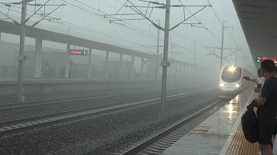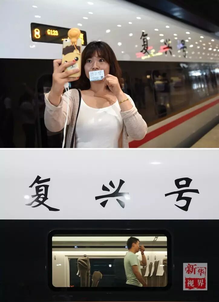 拼版照片:上图为在北京南站,一位乘坐“复兴号”G123次列车的乘客在车外与列车合影(新华社记者鞠焕宗,6月26日摄);下图为在上海虹桥火车站,乘客在“复兴号”G124次列车内行走(新华社记者丁汀,6月26日摄)。“复兴号”是由中国铁路总公司牵头组织研制、具有完全自主知识产权、达到世界先进水平的中国标准动车组。