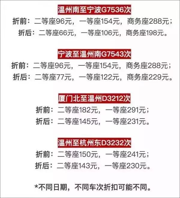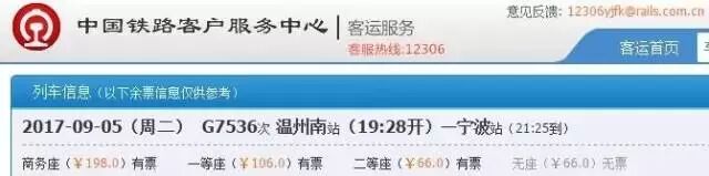 查询发现,从温州南至宁波的61趟高铁车次当中,19点28分从温州南发车的G7536次,二等座票价为66元,一等座为106元,商务座为198元。这趟车沿途如台州、临海等站,至宁波的票价也均有折扣。