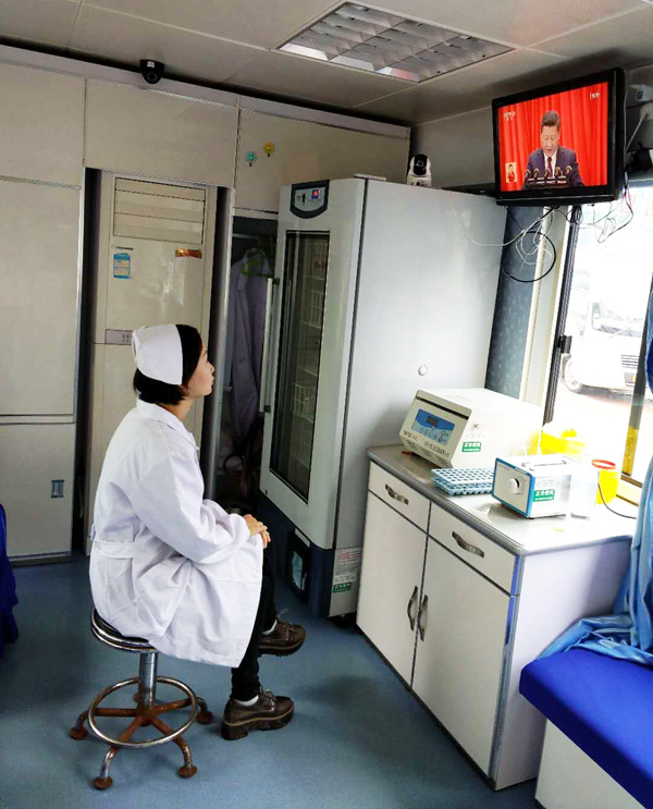 州中心血站工作人员在采血车上观看党的十九大会开幕会
