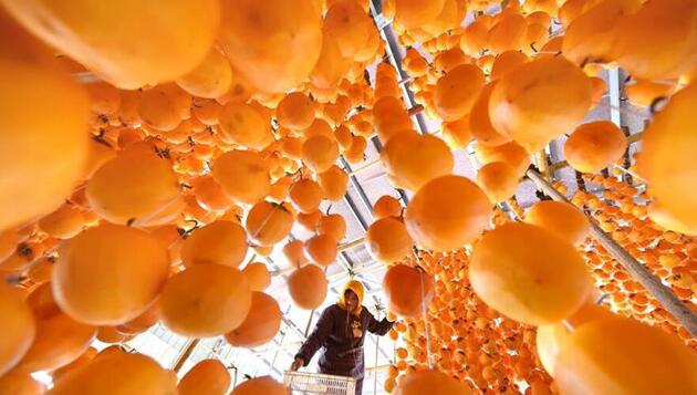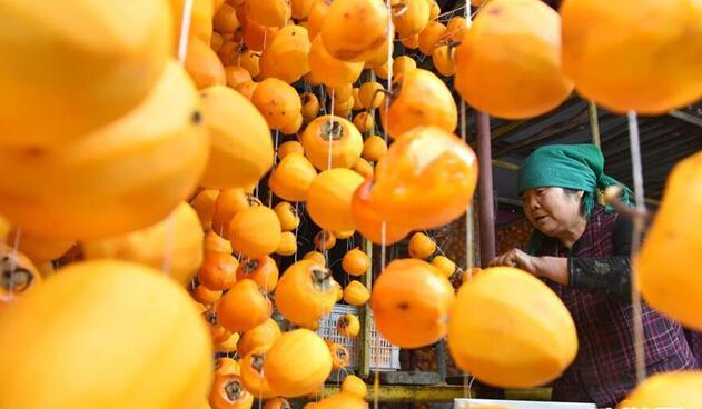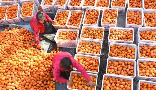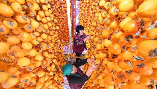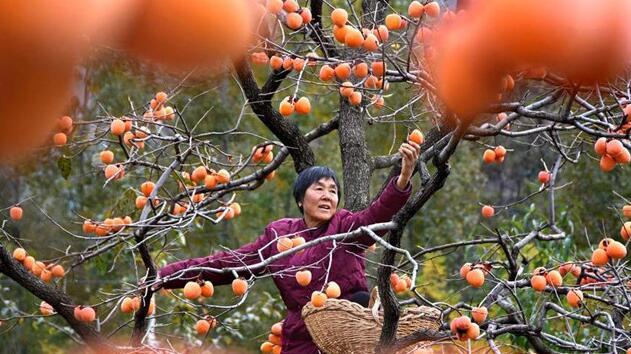 10月25日,山东省沂源县历山街道东鱼台村的农民在采摘柿子。金秋时节,山东省沂源县5万亩柿子迎来收获季,农民们忙着采摘柿子、加工柿饼,一派红火忙碌的丰收景象。 新华社发(赵东山 摄)