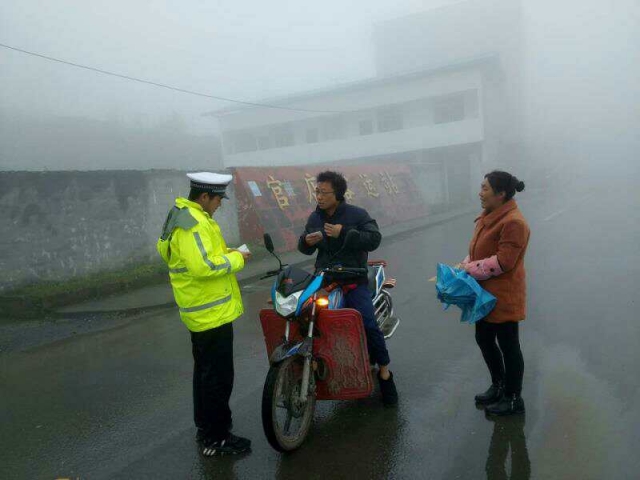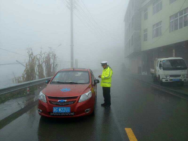 受持续的阴雨天的影响,建始县二高山及高山地区路面出现积水、结冰,且伴有浓雾,部分路段能见度不超过5米,而位于海拔1800米的官店,平均气温更是降至3℃,通行安全条件极差,为了预防交通事故,官店交警中队出动警力6人,从早上7点就在浓雾路段开展巡查,检查驾驶员、车辆的行车资质及证件,提醒交通参与者注意使用防雾灯和应急灯,截止