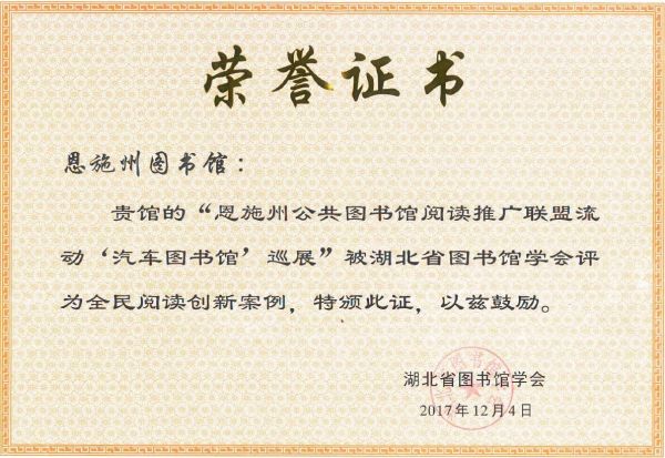 12月4日,在湖北省图书馆学会第六届理事会三次全体会议上,湖北省图书馆学会集中表彰了全民阅读优秀服务奖12个,全民阅读创新案例奖6个。其中,恩施州图书馆组织的恩施州公共图书馆阅读推广联盟流动“汽车图书馆”巡展被表彰为全民阅读创新案例。