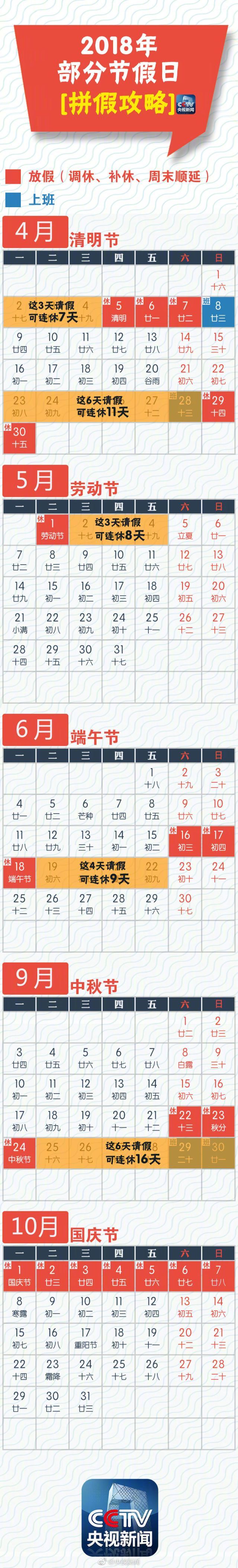 ①4月2日-4日,请假3天,连清明节可连休7天;②4月23日-28日,请假6天,连劳动节可连休11天;③5月2日-4日,请假3天,连劳动节可连休8天;④6月19日-22日,请假4天,连端午节可连休9天;⑤9月25日-30日,请假6天,连中秋节和国庆节可获16天奢华长假!