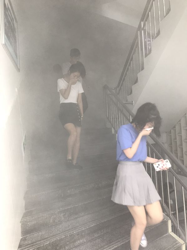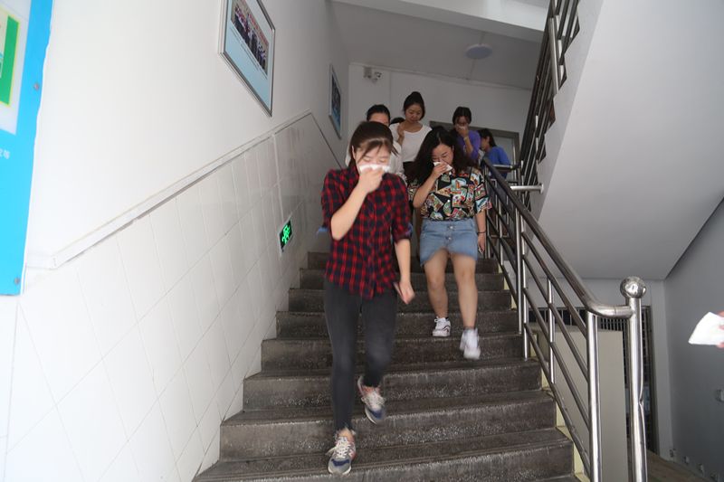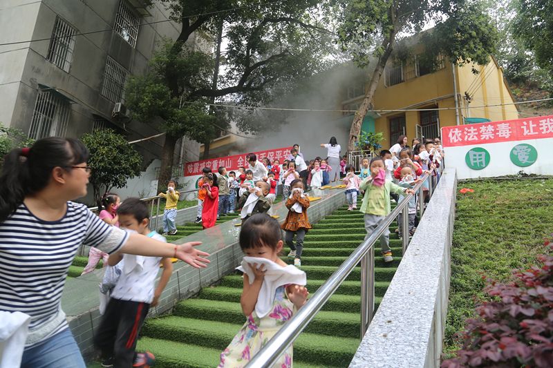 9点半疏散演练正式开始。恩施州图书馆四楼综合部燃起烟雾,火警警铃响起,在工作人员的引导下,读者和职工用湿毛巾捂住口鼻,依次有序撤离到楼下空旷处。同时,幼儿园的小朋友在老师们的带领下,也安全撤离教室,到达指定地点集合。