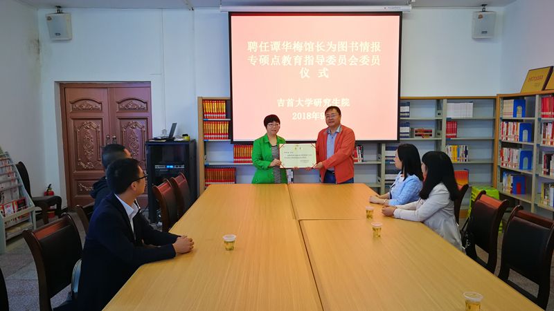 9月28日,吉首大学信息资源研究所所长、学科带头人、研究馆员刘泳洁一行四人专程来到恩施州图书馆,受学校领导委托,聘任恩施州图书馆馆长谭华梅为吉首大学研究生院图书情报专硕点教育指导委员会委员,并为其颁发了聘书。在此之前,恩施州图书馆已经授权成为了吉首大学图书情报专硕点教学实践基地。
