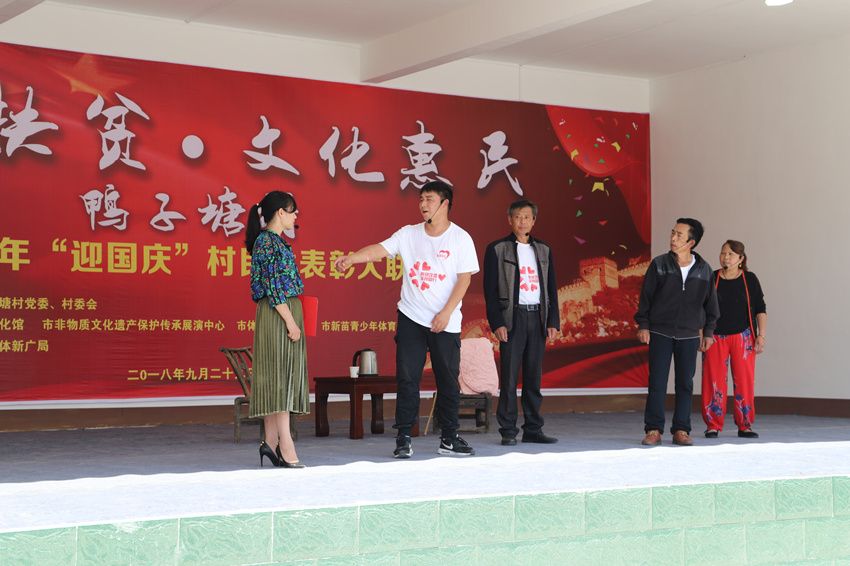 9月29日,恩施市舞阳坝街道办事处鸭子塘村举办了一场别开生面的“迎国庆”表彰暨精准扶贫•文化惠民大联欢活动。此次活动由市文体新广局指导,鸭子塘村党委、村委会主办,市文化馆、市非遗保护传承展演中心、市体校、市新苗青少年体育俱乐部协办。