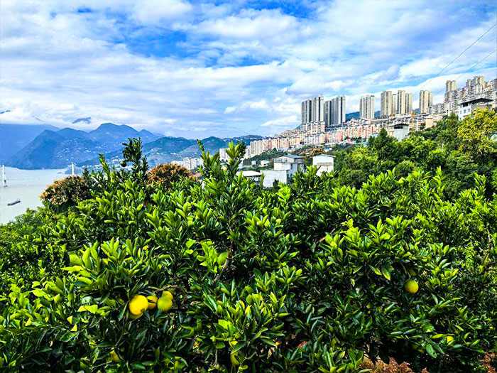 沿江而行,城市建筑与生态果园相映成趣。江岸边的脐橙园绿意盎然,既筑起了坚实的生态屏障,也成了群众增收的“绿色银行”。这片绵延的绿色,不仅守护着长江的生态环境,更承载着百姓致富的希望。