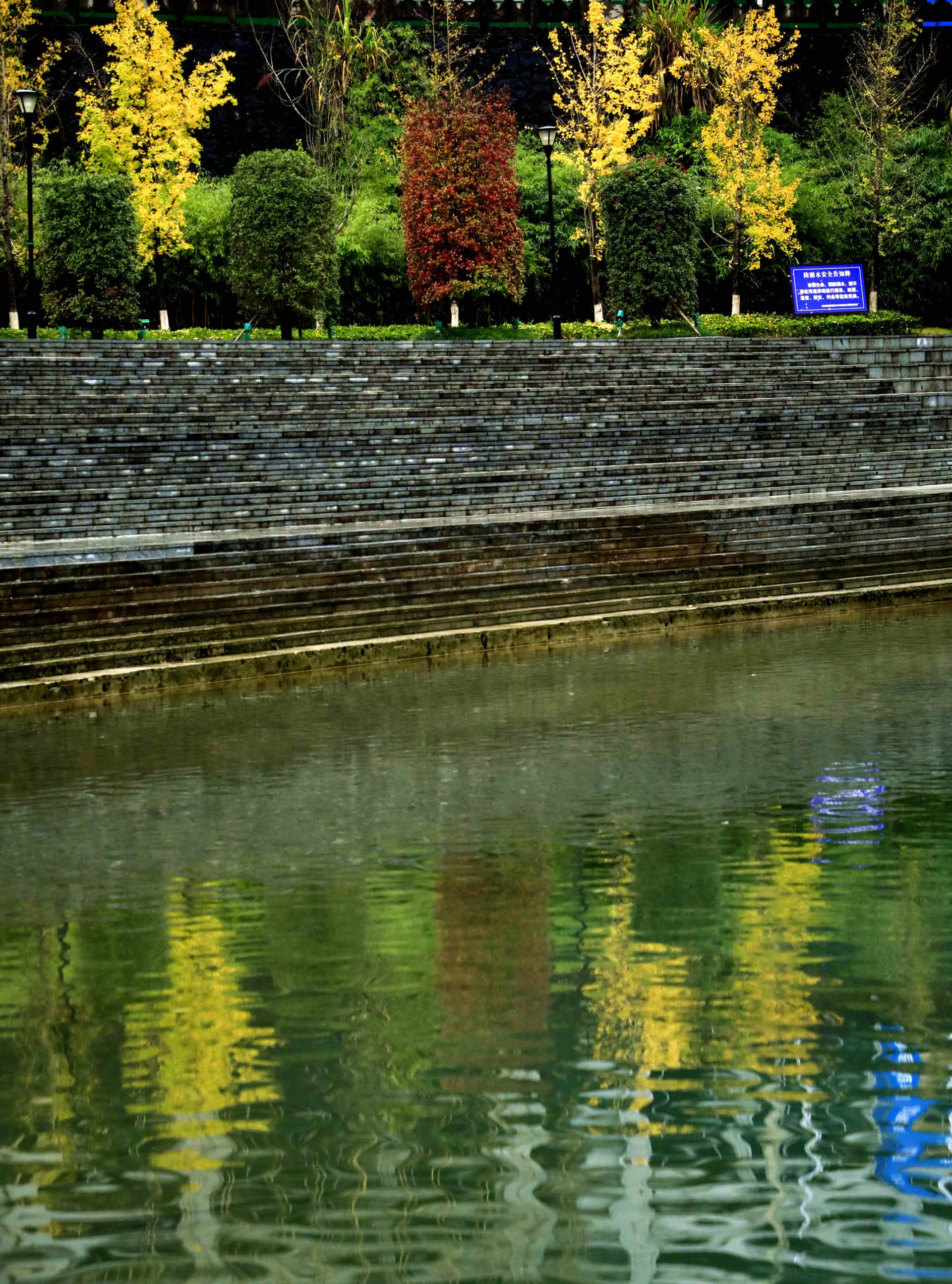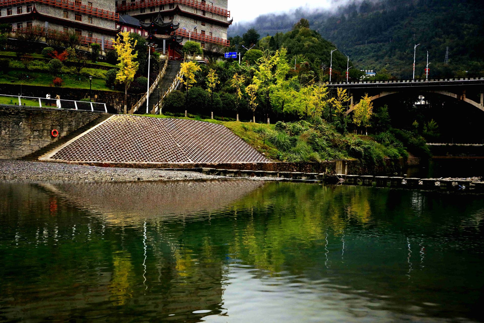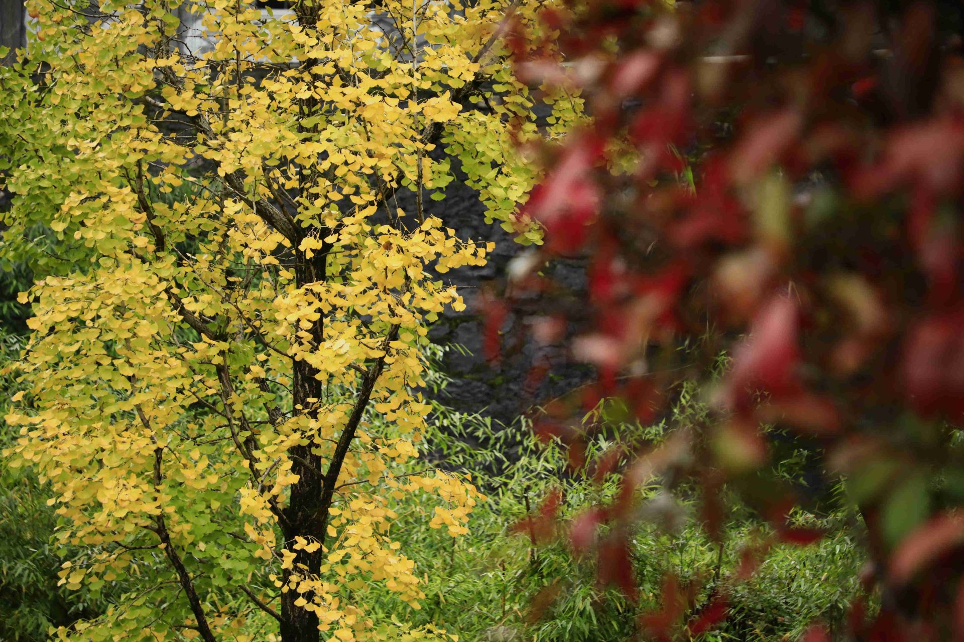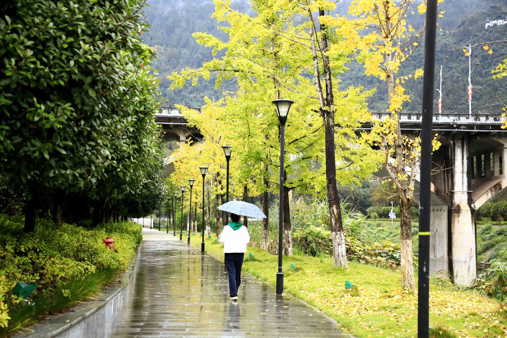 金黄银杏下,彩伞游人,一步步踏过跳石,像把初冬鹤峰的浪漫,都踩成了流动的诗。