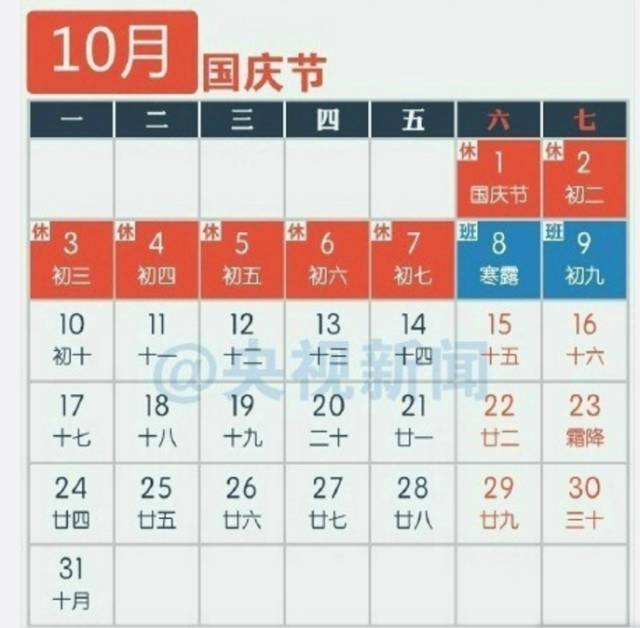 10月8日、9日是周末,但调休后需要上班。