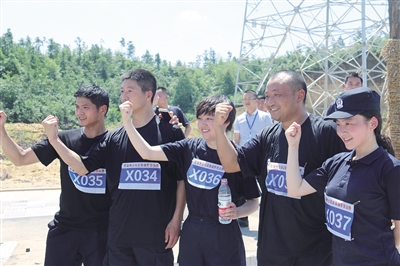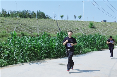 登山比赛起点设在湖北民族学院南门,终点在金龙大道东段站前小路全程10公里,队员既需穿越陡坡泥泞路段,又需顶着烈日跑完5公里的铺装公路,还要按照规定扎武装带,携带手铐。
