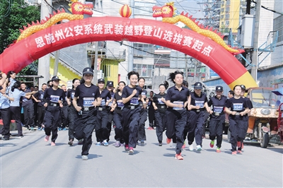 6月16日上午,全州公安系统武装越野登山比赛在恩施市龙洞河举行,70余名来自全州公安机关的运动员顶着36度高温,一路穿越林中小道、高架桥、高速公路连接线,圆满完成10公里武装越野登山比赛。