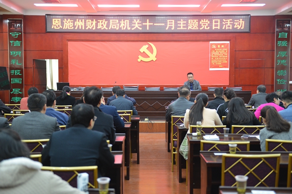 11月7日下午,恩施州财政局组织举办十一月主题党日活动。活动首先完成了奏国歌、重温入党誓词、缴党费等规定程序,接着以讲党课的方式进一步拓展主题党日活动内容。