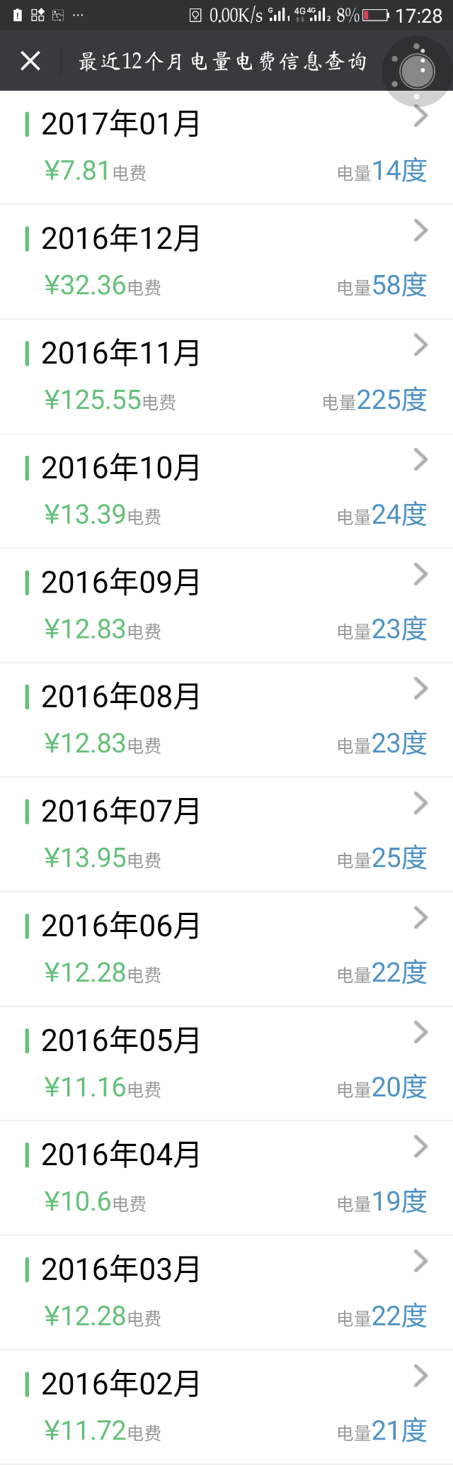 今年我家换了新电表,新旧电表交替的那个月(图中11月)的电费猛增,但以后又趋于平衡。我对旧电表的最后读数有十分大的怀疑,因为我们家那个月并没有大的生产,并且电表工也未将最后示数给我们看。 可能也有不少农户家蒙在鼓里。望有关部门明查。