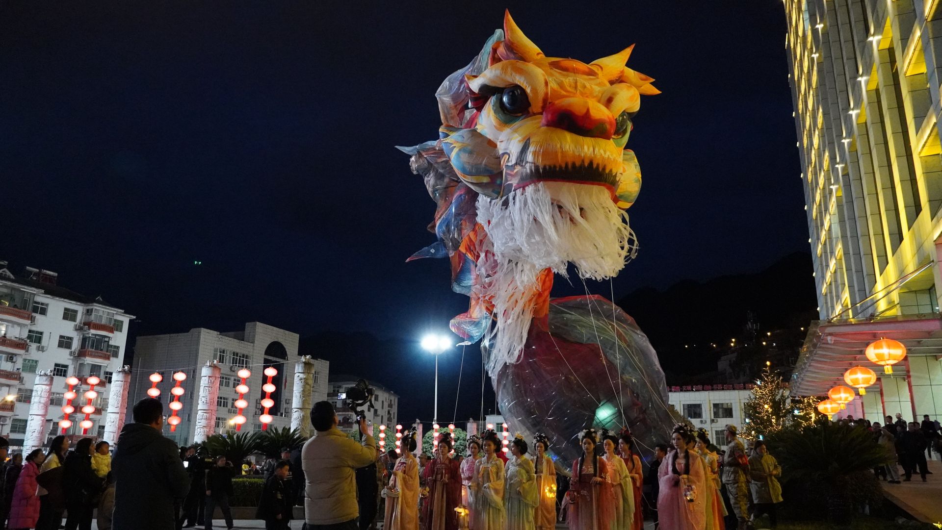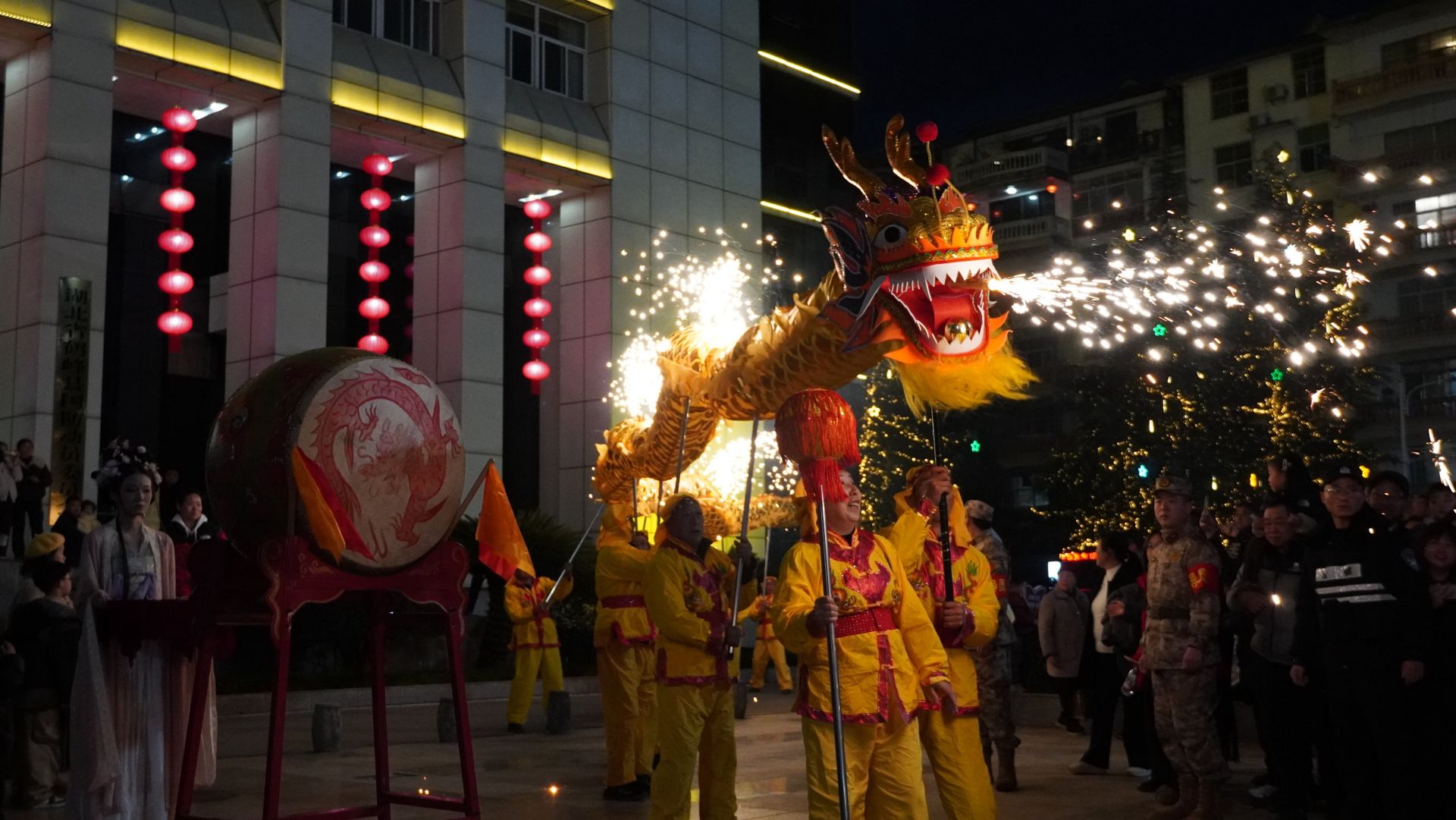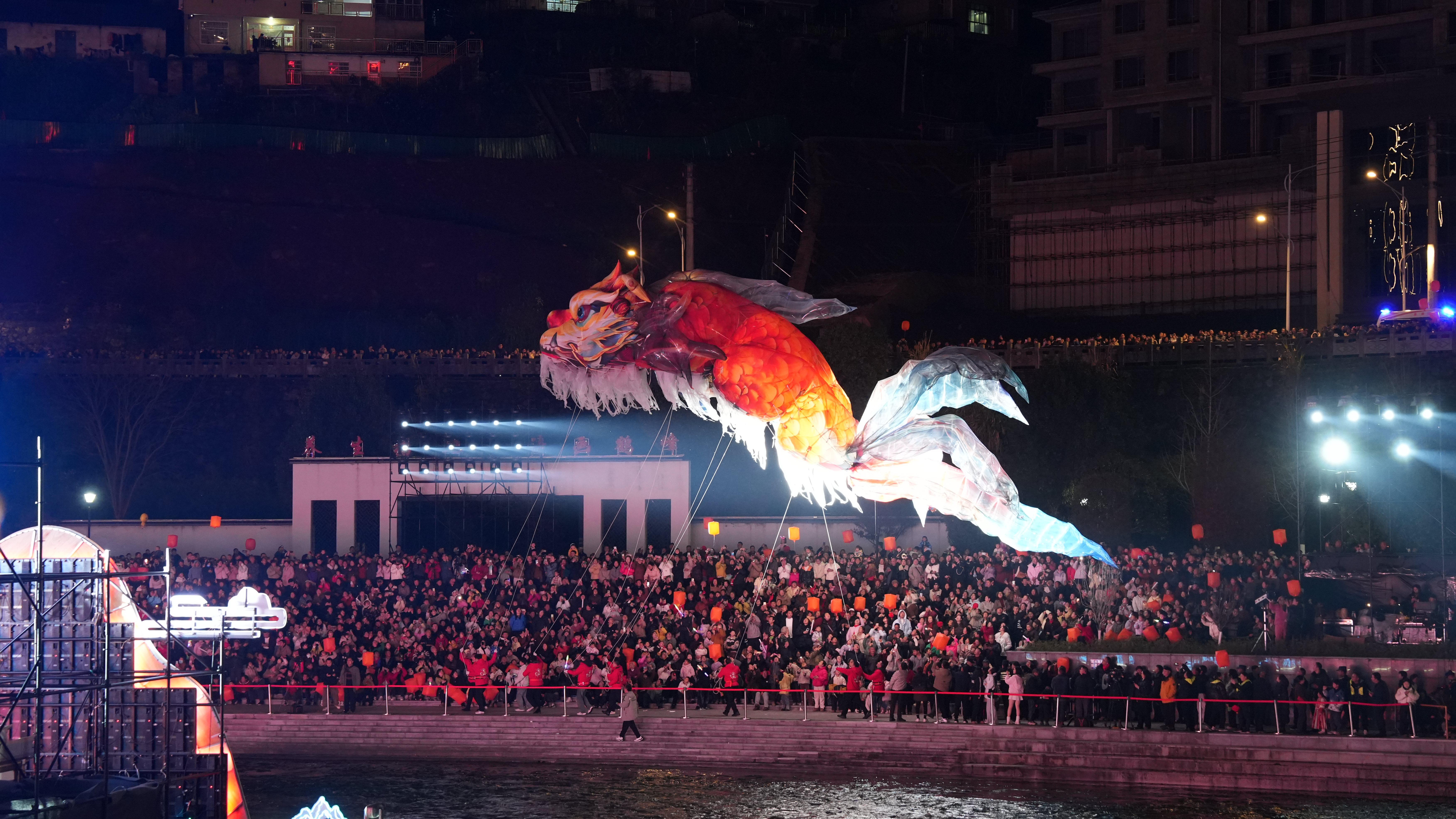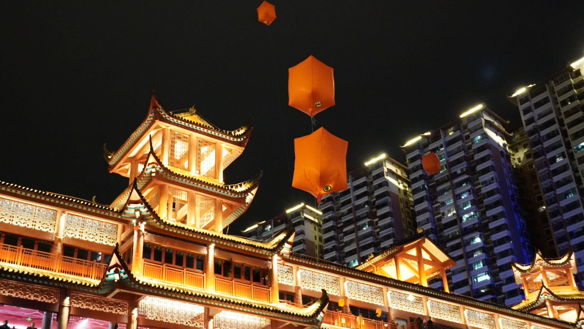 孔明灯从河畔飞向夜空,九龙广场上火龙钢花、炭火舞、土苗篝火表演再一次闪耀夜空,非遗技艺与民族文化碰撞出璀璨火花。