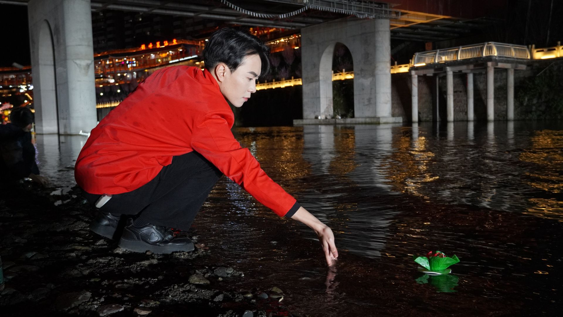 月亮湾水域热闹非凡,水上飞人凌空翻腾、精彩歌舞轮番上演,各类节目应接不暇,现场掌声阵阵,直播间内也好评如潮。溇水河畔,市民们小心翼翼地将河灯轻轻放入水中,数千盏河灯随波逐流,灯光倒映水面,与河畔灯火交相辉映。