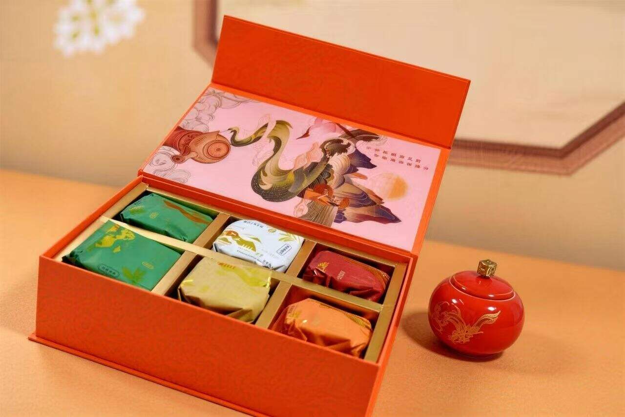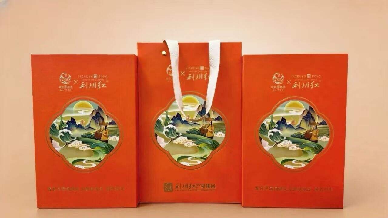 新茶食包装设计上颇费心思。外盒借窗棂框景手法,以圆形视窗透出茶乡意蕴;内置硫酸纸插描绘出“凉城云海藏诗画,利川红韵动楚天”的意境,开启时呈现“开盒见礼、翻页品韵”的沉浸体验。整体以暖橙为主色调,联名标识鲜明,兼具礼赠雅趣与文化厚度。